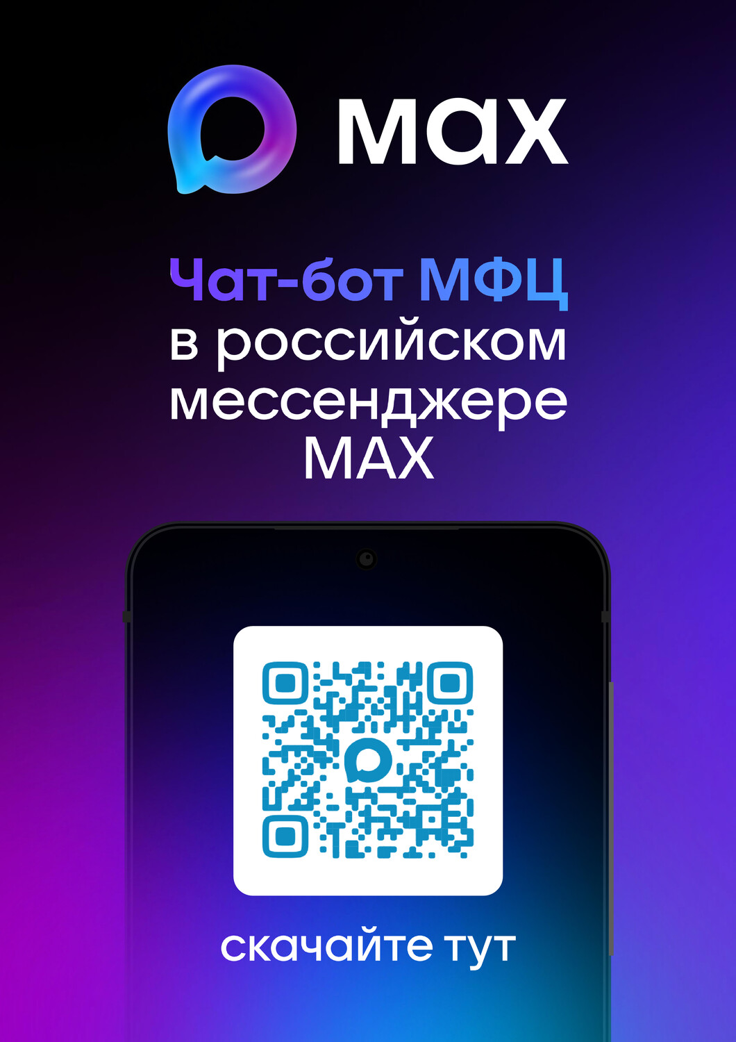 Установить чат-бот просто. Достаточно отсканировать QR-код на картинке или пройти по ссылке: https://max.ru/mfcvladimir_max_bot, а затем нажать «Запустить бота» и кнопку «Начать».
